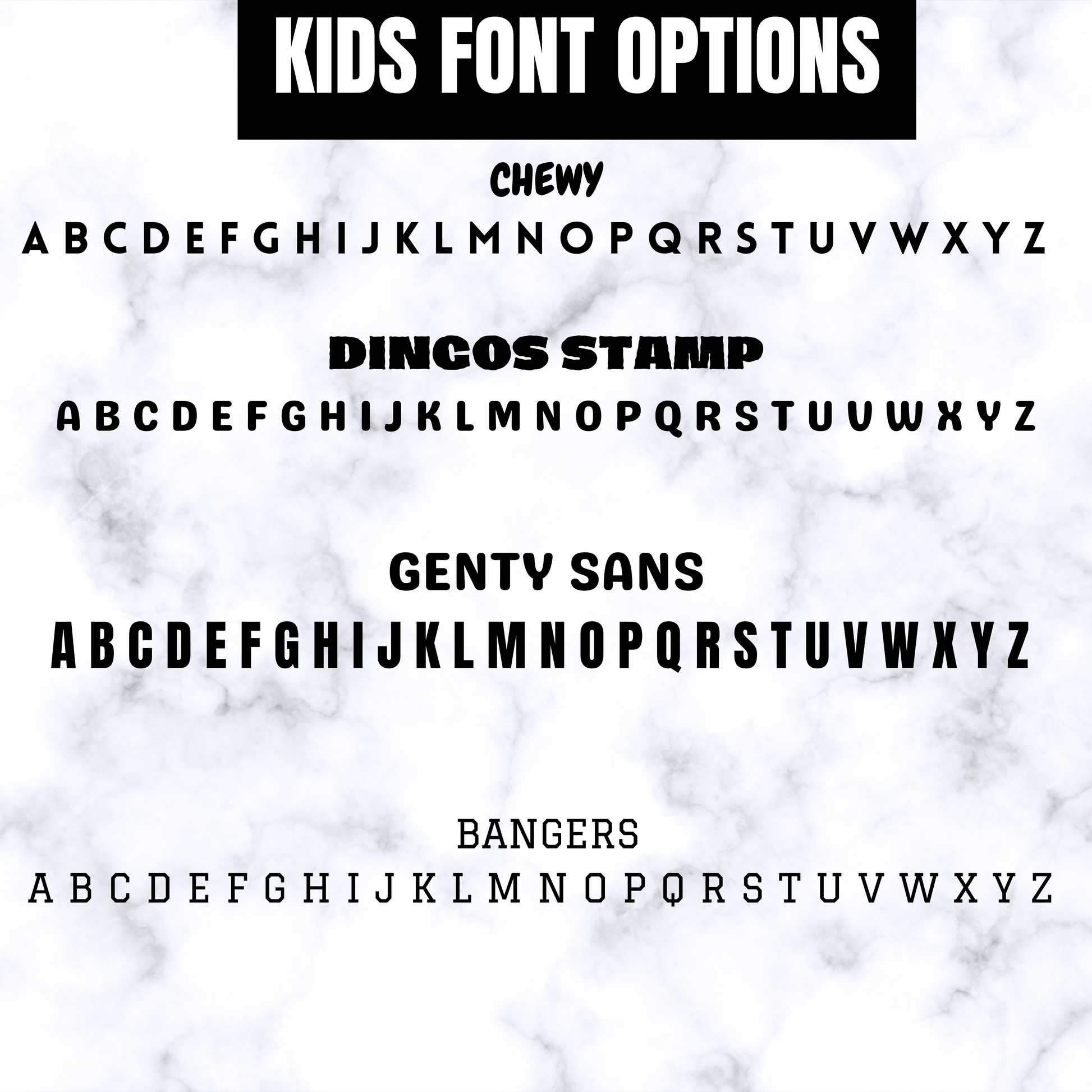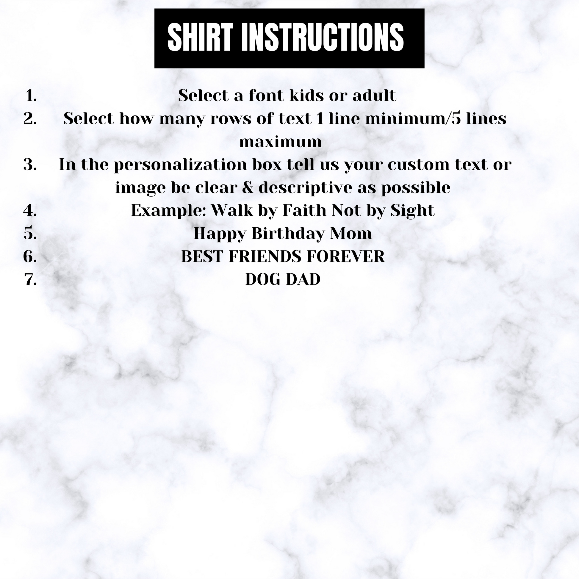 We'll design a shirt for you with your custom lettering! Simply select your shirt color and size, and include your text and font selection, and we'll be in-touch with a proof* in 1-3 business days! Designs are printed one-color on the front of the shirt. If you wants