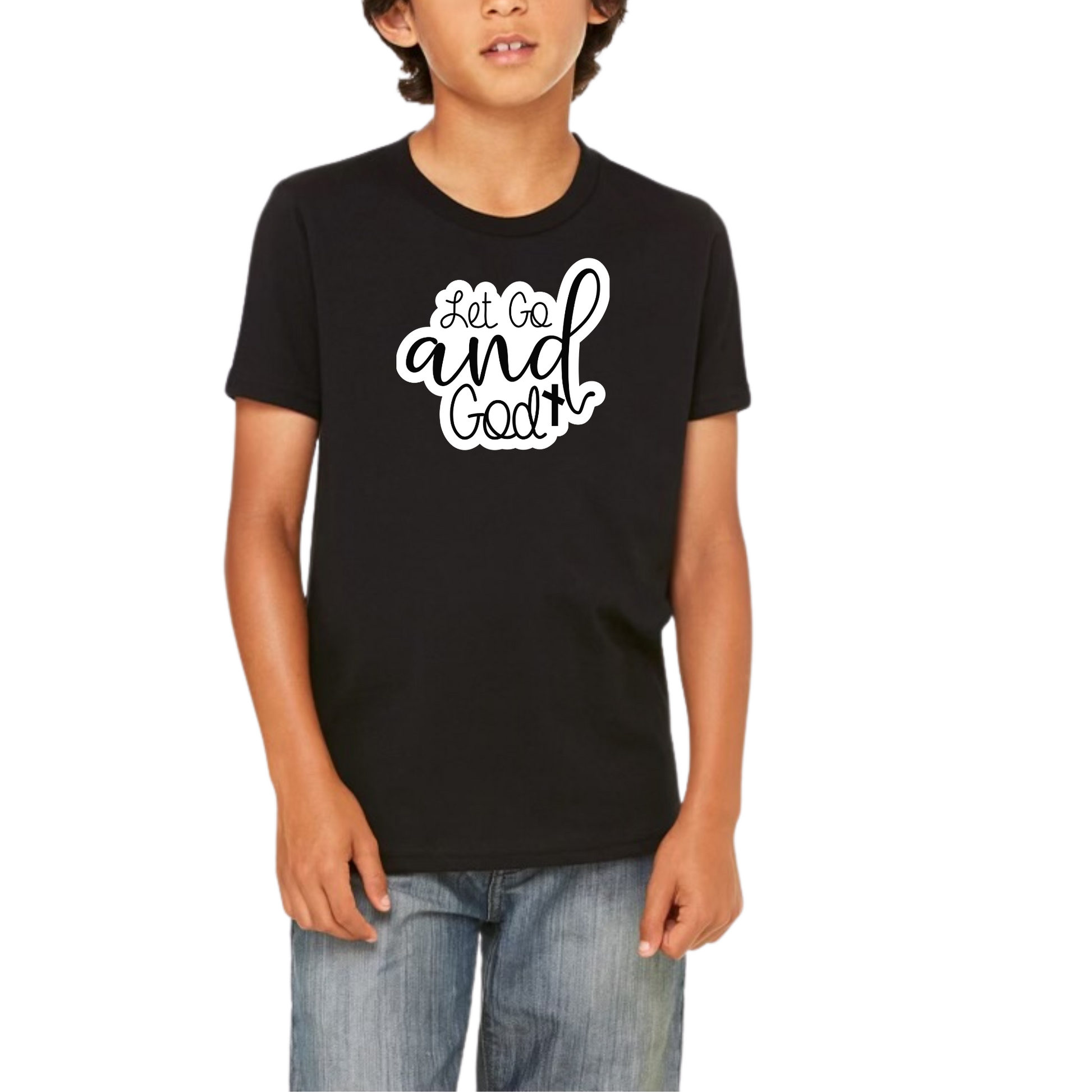 The uplifting phrase "Let Go and Let God" is boldly printed on the front of the shirt, serving as a gentle reminder for children to release their worries and fears, and to trust in the divine guidance and wisdom of God. Whether they're facing challenges at school, in friendships, or at home, this message encourages them to surrender control and find peace in God's plan.