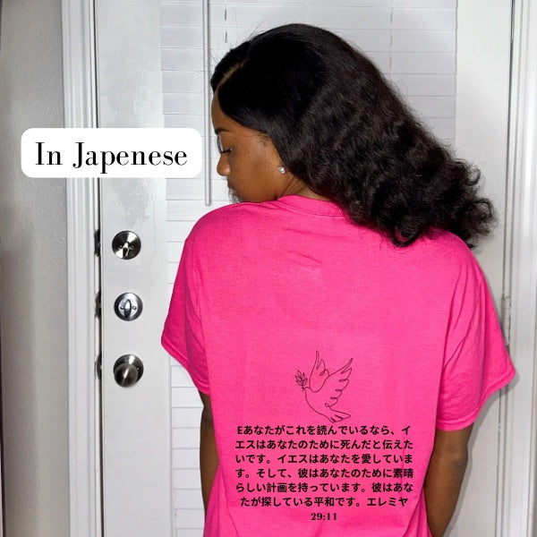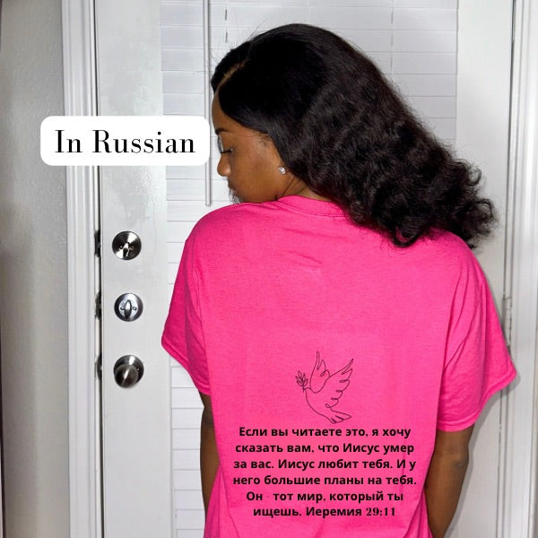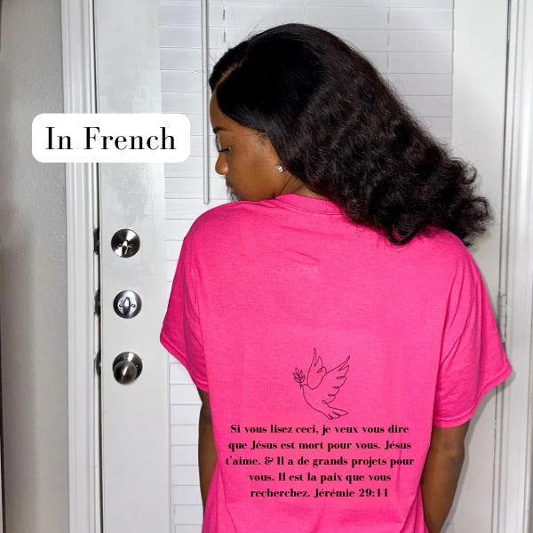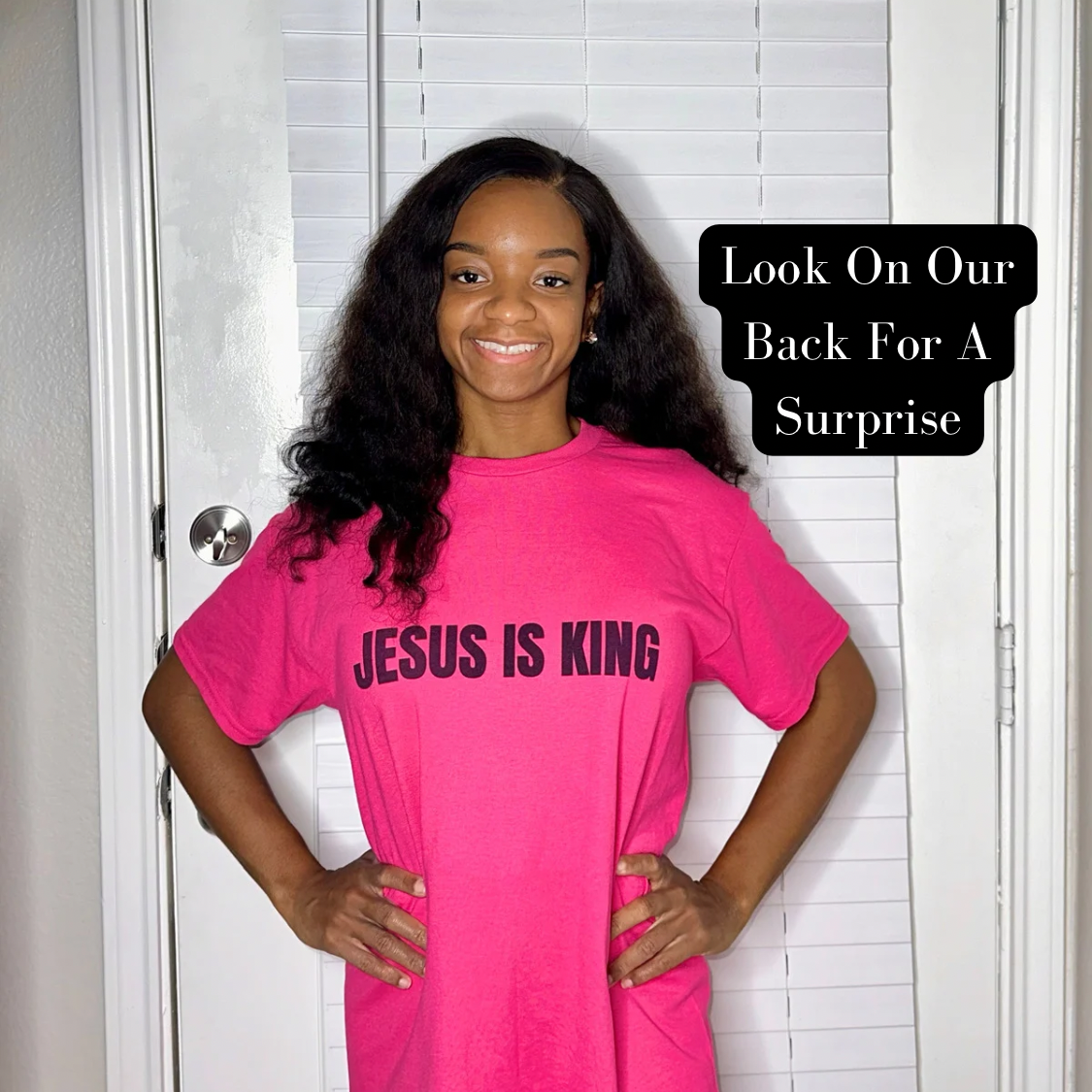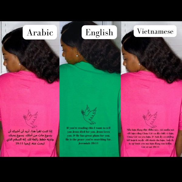 Elevate your faith-inspired fashion with our "Jesus is King" t-shirt. Made with soft, breathable fabric and featuring a powerful yet minimalist design, this shirt is a testament to your unwavering belief. Whether you're at church, hanging out with friends, or running errands, let your shirt speak volumes about your devotion to Christ. Available in a range of sizes, it's the perfect addition to any Christian's wardrobe. Our goal is to spread the message to every culture & race. Heaven will be one big melting pot. So let your fashion do the talking for you. On the back it says “If you’re reading this I want to tell you Jesus died for you. Jesus loves you. & He has great plans for you. He is the peace you’re searching for. Jeremiah 29:11” in 10 different languages. This tee is great for college kids, work places, sporting events, get togethers & more. We come into contact with many different races & often times not able to speak their language. So this tee will help you do just that. Everyone needs Jesus. We chose hot pink & lime because those colors after times catches people eyes due to the bright color, & once someone eyes land on your shirt they will see what it says.